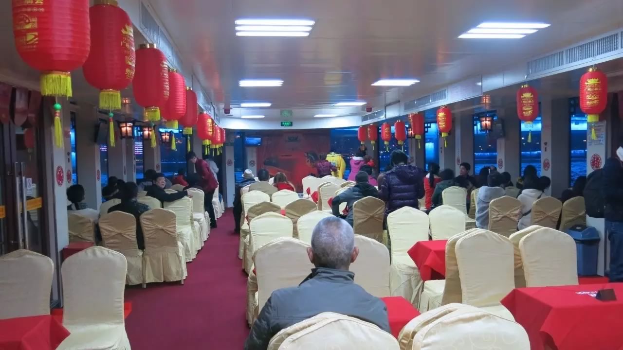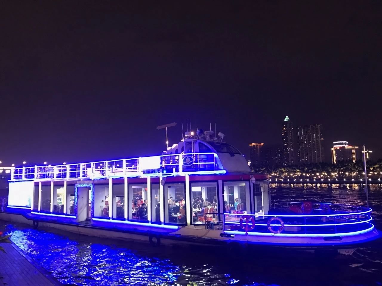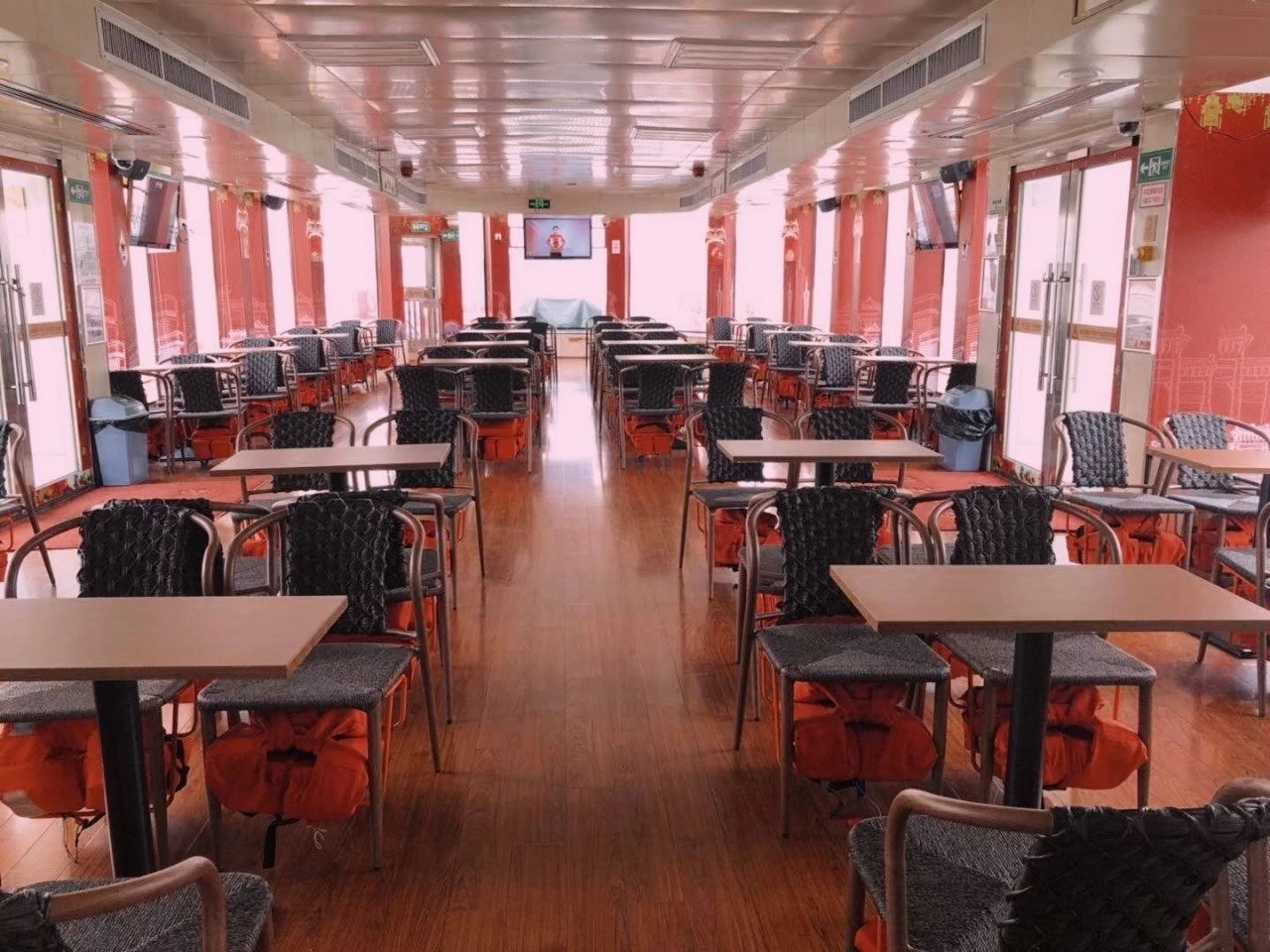 新型游船 199客位双层游船一楼空调大厅设100座位,二层露天观光平台设66座位。一楼大厅配有先进语音播放系统,全落地玻璃窗透明设计使船具有很好的观光性。游船二楼为360度无遮拦观景平台让您无论身处何方整个羊城美景一览无遗。