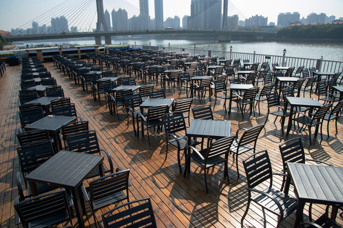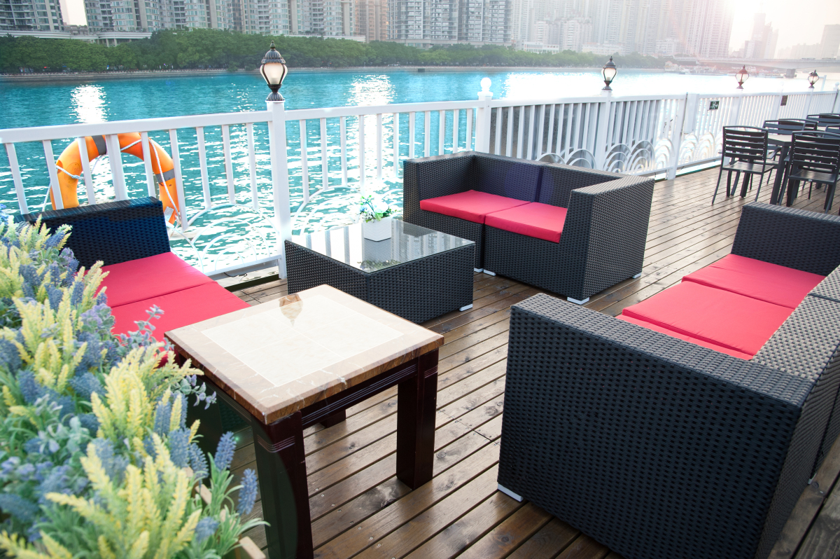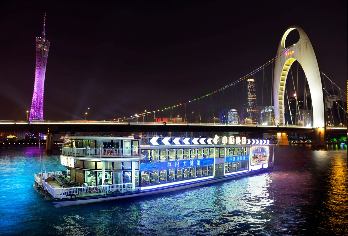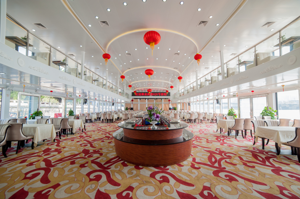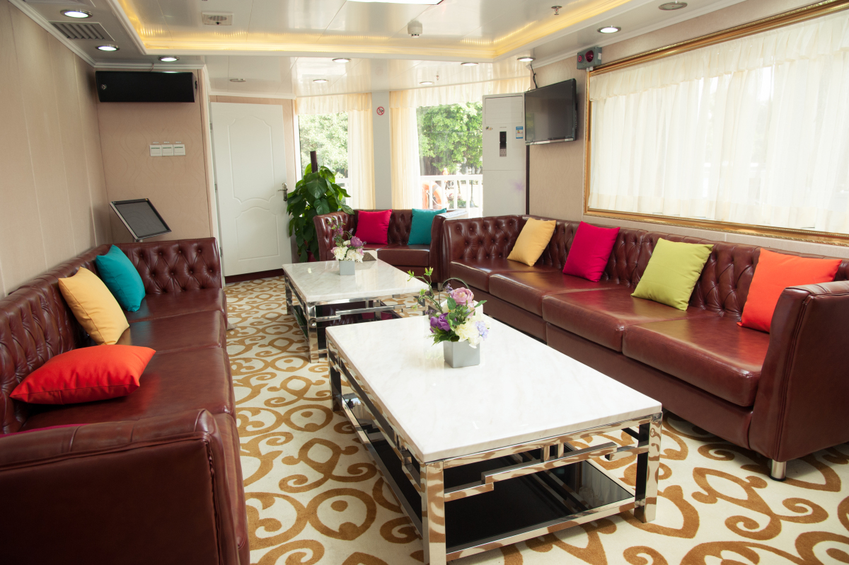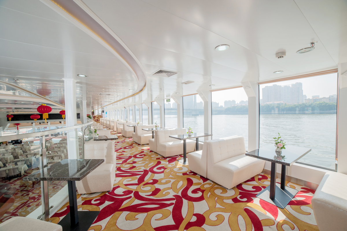 一二层中间为掏空的楼中楼设计。楼距高,豪华大气。在精致的欧式天花吊灯映射下,整个大厅富丽堂皇。面对船头,大型的落地玻璃幕墙环绕的面前是一个30平方的演出舞台。夜幕下珠水璀璨,舞台上载歌载舞,背后是美轮美奂的珠江夜景。游船上设有自助餐台,贴心的提供着色香味。游船二层设有包厢,如果你想独自享受这珠江夜景的独特魅力,不妨邀上三五知己,包厢里谈天说地间,享受私密的乐趣。露天观光平台设计在三层,是一个让你零距离接触羊城夜魅的首选去处。宽阔的场地,座位井然。
