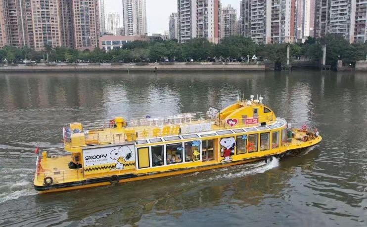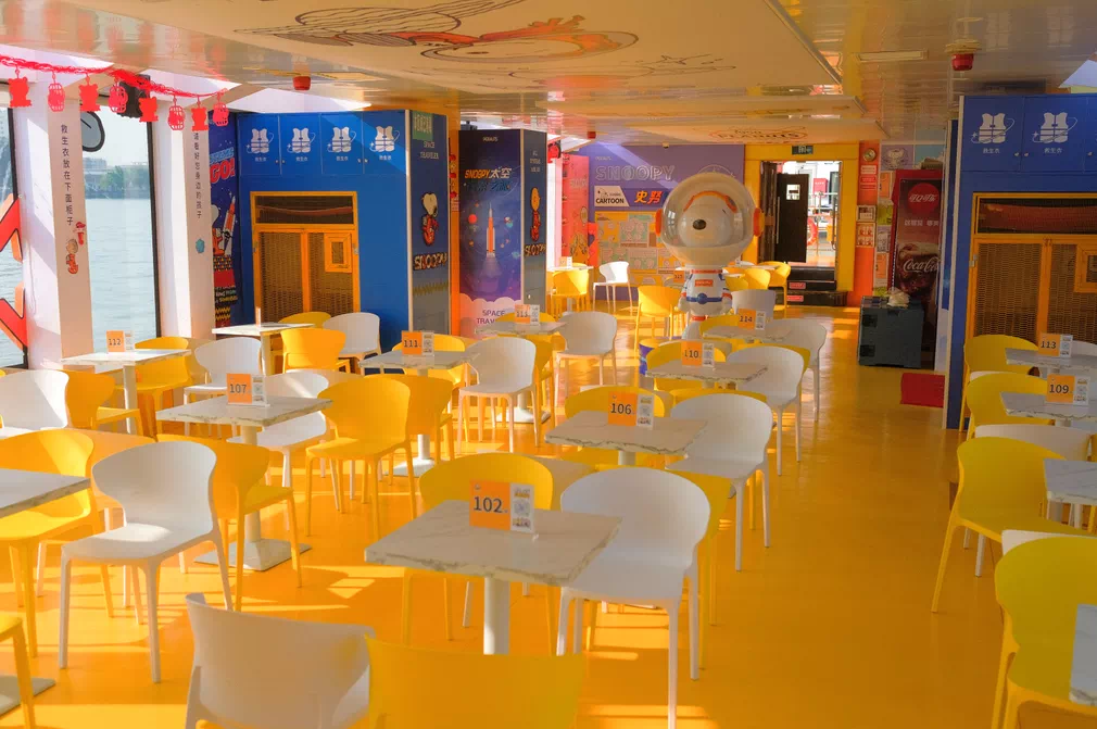 史努比超治愈的暖黄色船瞬间将你带回到童年的幸福时刻。30米+的史努比漫画长卷覆盖了船舱的整个天花板,从背景墙到展览陈列柜窗台、空调柜、桌面……每一处都经过精心布置,带你走进神秘的史努比太空世界。 主题船二楼是开阔的露天甲板,坐拥360度珠水美景光影流动给人身临宇宙的错觉。