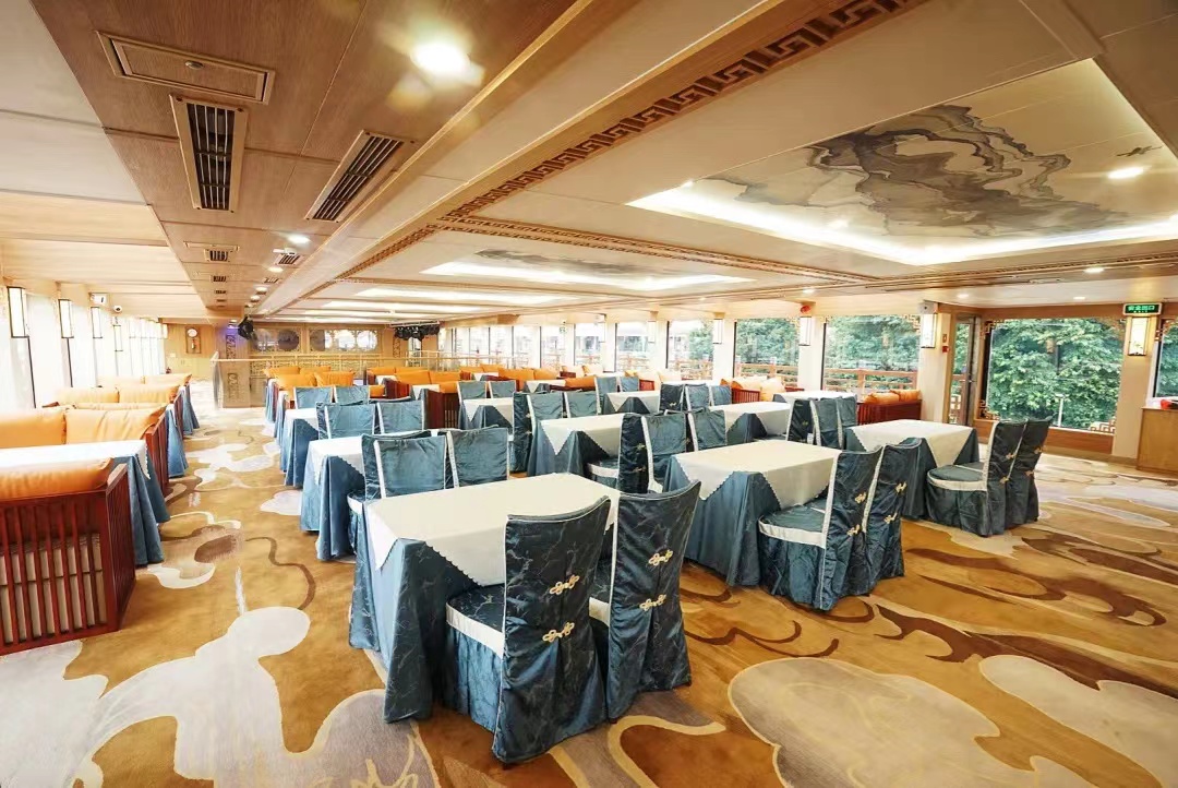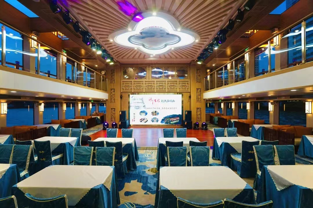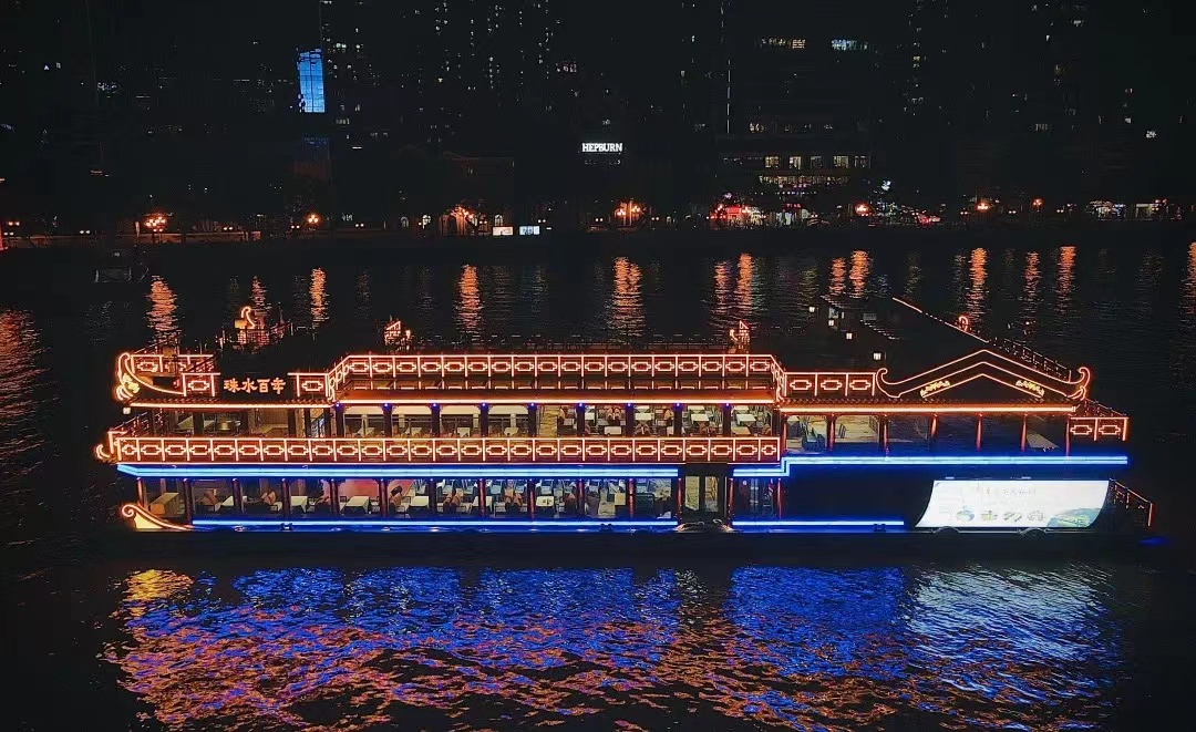珠水百年号是300客位三层豪华游船,设计采用传统风格与现代理念相结合,灵感来源于岭南建筑代表“镬耳屋”,古色古香的外形设计既体现广府风格的岭南亲水文化内涵,又尽显传承千年的传统艺术与羊城文化。游船设施设备齐全,适用于商务会议、接待活动、发布会、婚庆等多功能活动。